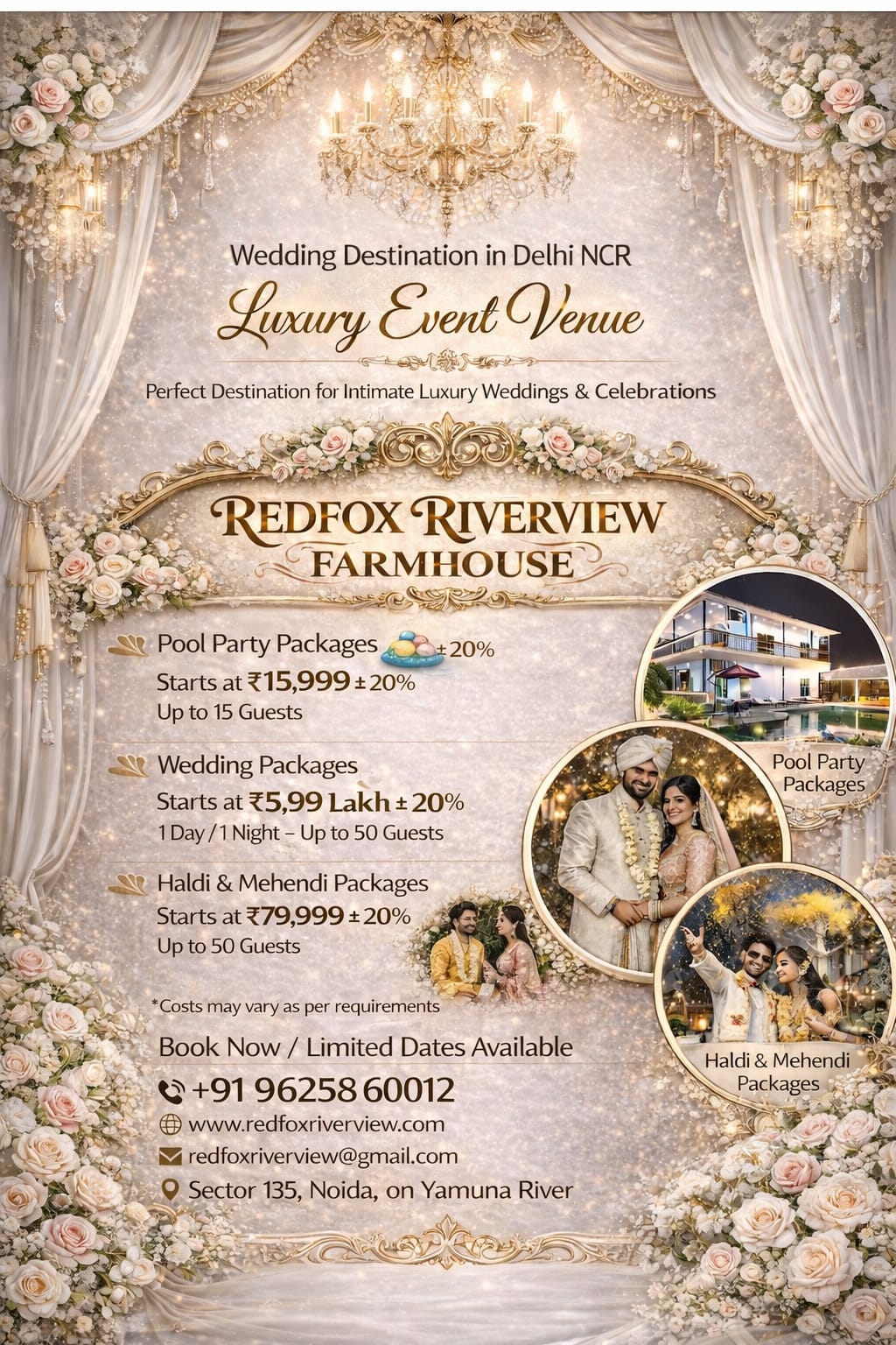We specialize in hosting Weddings, Haldi & Mehndi ceremonies, Corporate Events, Birthday Celebrations, Anniversary Parties, and Pool Parties. With spacious outdoor areas and a peaceful ambiance, Redfox Riverview Farm is the ideal destination to celebrate your special moments with family, friends, and colleagues.